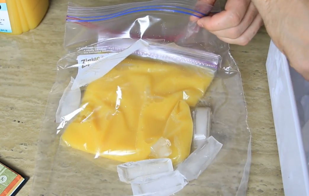 He filled a plastic bag with orange juice. minutes later.. i have to try this!